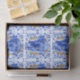 Weimaraner colourized in blue hues with a gold leaf letter "O" and a Blue and White decorative floral pattern background. This is a custom design for the Ontario Weimaraner Rescue and Assistance (OWRAssist). A percentage of the proceeds goes toward helping rescued Weimaraners.