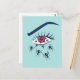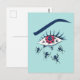 Weird eye postcard with a creepy illustration inspired by eye dryness and pain plus psychic distress. Features a psychotic female red eye with long eyelashes and a strange pupil with white dots reminding of space. Ants are crawling out of the pupil, going across the eye and spreading all over the face.