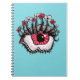 Weird eye notebook with a digital illustration depicting a creepy red eye with eyelashes which have their own eyelashes and are ending in flowers red and grey flowers over cheerful blue background. When sometimes your eyes are so strained that you are sure they will melt in the next three seconds. This psychedelic design is just for you if you like bright colours and weird art.