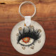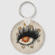 Weird eye keychain with a digital illustration of a female eye with broken iris made of lava and long eyelashes ending in bizarre flowers with angled petals in a cloudy grey sky.