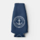 Bottle cooler featuring a white, elegant anchor and rope emblem with customisable text "welcome aboard" and your boat name on a dark blue background.