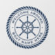 Window cling featuring a dark blue, elegant ship's wheel and rope emblem with custom text "welcome aboard" and boat name on a clear background.