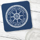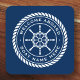 Coaster featuring a white, elegant ship's wheel and rope emblem with custom text "welcome aboard" and boat name on a dark blue background.
