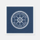 Napkins featuring a white, elegant ship's wheel and rope emblem with custom text "welcome aboard" and boat name on a dark blue background.