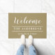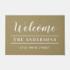Elegant and timeless custom doormat features "Welcome" in calligraphy script writing with your family's last name and your home's street address personalised in white with simple stripe accents. Note, the light bronze / antique gold / tan brown background and white text colours can be modified to coordinate with your porch or entry decor.