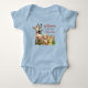 Farm animals baby welcome one-piece tee. Cute baby animals in the design include a floppy eared grey bunny sitting on a goat, a puppy, and a rabbit. All sit in front of a picket fence. Customise the wording which is, "Welcome.. to the farm.. little one". Each line of text is easy to change. Shown on a light blue pullover tee with snaps at the bottom.