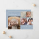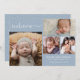 Announce the arrival of your newborn baby boy with this modern dusty blue double sided birth announcement. Front features a four photo collage of your favourite baby photos with welcome in a script typography. Personalise with your baby's name, birth date, birth stats and parents names.
