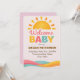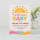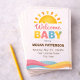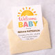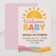 A bright and cheerful welcome baby shower invitation featuring a smiling sunshine, soft pastel clouds, and a joyful sky-inspired background. The warm yellow tones and playful watercolor style create a happy and inviting atmosphere, perfect for celebrating a little one on the way. Designed for sunshine-themed baby showers with a sweet and uplifting feel.