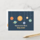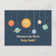 Welcome to the world, little newborn! This cute greeting postcard is great for sending your well wishes to new parents. It features cute doodles of a sun and various planets including Earth with cloud eye brows.