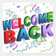Beautiful welcome back stickers. Streaming confetti falling on colourful block lettering in a rainbow of colours. Perfect for a happy homecoming event.