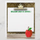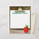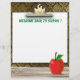 Cute custom letterhead stationery on a gold clip hanging from pretty damask wallpaper that says "Welcome Back To School" in green bold 3d look text. Or, just leave out the text entirely by deleting it. One red apple with green leaf illustration on a wooden desk is on the bottom corner. Lots of copy space to write on later. Great personal gift idea for teachers, doctors, nurses, health professionals, etc. Remember, "An apple a day, keeps the doctor away!"
