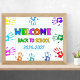 Welcome Back To School First Day Of School Poster. A bright and cheerful design featuring colorful handprints and playful “Welcome Back to School” text with customizable years, perfect for celebrating the excitement of the first day. This vibrant poster adds a fun and welcoming touch to classrooms, helping students feel happy and ready for a new school year.