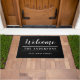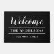 Elegant and timeless custom doormat features "Welcome" in calligraphy script writing with your family's last name and your home's street address personalised in white with simple stripe accents. Note, the black background and white text colours can be modified to coordinate with your porch or entry decor.