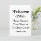 Welcome card sign to display during home showings features a classy black and white custom design: "Welcome, please remove your shoes or use shoe covers". Personalise the custom text to suit your occasion.