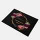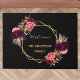 A chic black background. Decorated with a faux gold geometric frame and burgundy, pink and rose gold coloured flowers, florals. With the text: Welcome. Personalise and add your family name. Golden coloured letters.