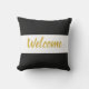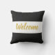 A wide, white striped goes across this black pillow, creating a black stripe at the top and bottom. The pillow has a classic black-and-white colour scheme. Personalise the throw pillow with your desired text in faux gold script. (Text currently reads 'Welcome').