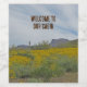 Looking for a way to promote your cabin vacation rental? Welcome guests to your vacation rental with this wine bottle label featuring a landscape photo of yellow wildflowers blooming in the Arizona desert. The carpet of flowers is seen in the foreground with a lone saguaro cactus and a mountain in the distance. "Welcome To Our Cabin" can quickly be customised to suit your rental needs.