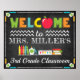 Welcome sign features fun colourful typography. Classroom supplies graphics and apple for teacher. Cute and perfect for a school classroom welcome sign.