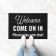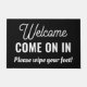 Custom outdoor rug featuring "Welcome, come on in, please wipe your feet!" for home or business.