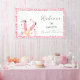 This charming welcome banner for the Boots & Bubbly Bridal Shower features a playful design with a woman’s legs kicking up her cowboy boots, surrounded by retro stars. A pink cowboy hat adds a fun touch, while a vase of flowers and pink Champagne with glasses set the perfect celebratory tone. The background is a whimsical pink cow print.