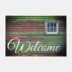This doormat has a window pictured on it and it says "Welcome" on it.