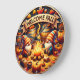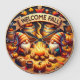 This festive clock features two whimsical gnomes in colourful, striped hats sitting by a roaring campfire. They are surrounded by pumpkins, wooden barrels, and fallen autumn leaves on a wooden floor. A banner at the top of the clock face reads "WELCOME FALL". The clock hands are black and the design is framed by a gold-coloured border with autumn leaves and berries.