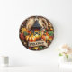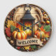 This festive clock features a detailed autumn scene with a large, rustic lantern illuminating the centre. The lantern is surrounded by colourful pumpkins, acorns, and a variety of autumn leaves in shades of red, yellow, and green. A banner across the bottom reads "WELCOME" and the entire design is framed by a decorative rope border. The clock face has black hands and stylised numbers, set against a background of wooden planks.