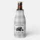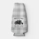 A bottle cooler featuring artwork of a vintage farm tractor silhouette with text reading "Welcome to our farm" and your family name, established date or other desired text. This unique design rests on top of a grey and white country plaid print. To see more designs like this, feel free to visit my store here at "Zazzle.com/Rustic_Charm". Thanks.