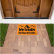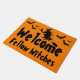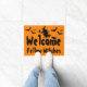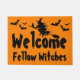 A cute Halloween doormat with a flying witch, her familiar and flying bats that says: Welcome Fellow Witches.