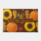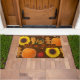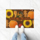 Fall season doormat with pumpkins, sunflowers, leaves and gourds. Orange text in the centre is, “Welcome Friends”. Colours are seasonal brown, orange, yellow, and red.