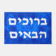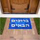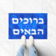 White Hebrew text reading, "B'ruchim Haba'im" (ברוכים הבאים - welcome) on a serene blue and white fractal image reminiscent of feathers or clouds. There is also a small Star of David (Magen David) in the centre.