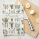 Herbal tea kitchen dish towels. "Welcome friends" is the sample wording across an off-white strip, bordered by rose pink. Green herbs and stems mix with dotted teapots in this pretty all-over pattern, printed on one side only.