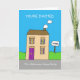 A cute cartoon house with smoke coming out of it's chimney. The words 'You're invited to a Welcome Home Party' accompany the image.