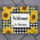 This cute and colourful floral welcome mat has yellow and orange sunflowers with a Welcome message and a customisable name. The black and white buffalo plaid background gives a cute country farmhouse feel. Greet visitors with an outdoor mat that will enhance your yard decor.