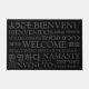 Welcome in many different languages black and charcoal grey elegant serif typography modern fun pattern Doormat.