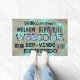 This is a cool silver and turquoise abstract design WELCOME doormat in many languages! It will make such a fun housewarming gift idea!