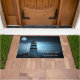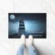 A faint light can be seen in the lighthouse tower. The lighthouse a symbol of hope in the darkest night, guidance and help. With the text: Welcome! Template for a family name, white letters. Use your back-space key to delete if you want the sign without text, name.