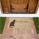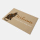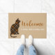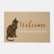 Doormat featuring a lovely plaid cat and some text " Welcome - A lovely cat is living here " Warm coloured pattern - tan solid colour background . Great for a cat lover's home . Also a nice warning to those who have feline allergy . Design by Alma Wad .