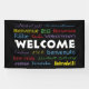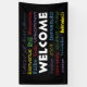A fun design that says welcome in many languages like Spanish, Japanese and French in a variety of colours like white, yellow and red against a black background