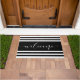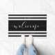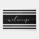 Welcome your guests to your home with your own custom personalized "Welcome" doormat. The design features a minimal and elegant design with "Welcome" displayed in elegant modern calligraphy. The letters extend to the edge with a modern white stripe design. Personalize with the family name and house number.