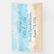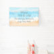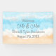 Personalised coastal themed wedding banner with bride and groom names and wedding date and a background of blue ocean waves and sandy beach.