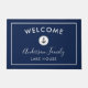 This welcome mat is a perfect accent to your beach or lake house. The design offers a boat anchor and rope with modern handwritten text for your family name on a dark navy blue background.