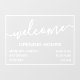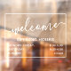Opening hours window cling featuring white or custom colour text on a transparent background with the text "welcome" in an elegant calligraphy script font.