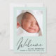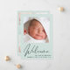 A simple and elegant mint green gender-neutral birth announcement. The front features your newborn's photo, full name, arrival date and birth stats, and "Welcome" written in a stylish script. On the reverse side of the card, you can add three additional baby photos and parent and sibling names, and a thank you, visitation or other sentiment.
