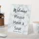 This business sign says Welcome Please Have a Seat. Additional text is near the bottom for your business name. All text is black and can be edited. Welcome is in an elegant script. The sign has a faux white marble background.