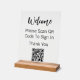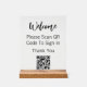 The display text can be edited to show your desired text. The text is black. Display text reads: Welcome Please Scan QR Code To Sign In Thank You. Welcome is in an elegant script near the top. The other text is not a script. Please enter the website URL for your QR code before placing your order.