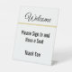 Welcome your visitors with this black white and gold welcome sign. The display text can be edited to show your desired text. Display text reads: Welcome Please sign in and have a seat Thank You