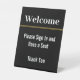 You can welcome your visitors with this black and white welcome sign. The sign is black. The text is white. Two faux (not foil) gold stripes are under the top line of text .The display text can be edited to show your desired text. Display text reads: Welcome Please sign in and have a seat Thank You