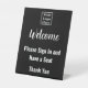 Welcome your visitors with this black and white sign featuring your business logo. It will appear above the white text. The display text can be edited to show your desired text. The top line is in a script. Display text reads: Welcome Please sign in and Have a seat Thank You