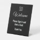 Welcome your visitors with this black and white sign featuring your organisation's logo. The display text can be edited to show your desired text. Display text reads: Welcome Please sign in and have a seat Thank You
